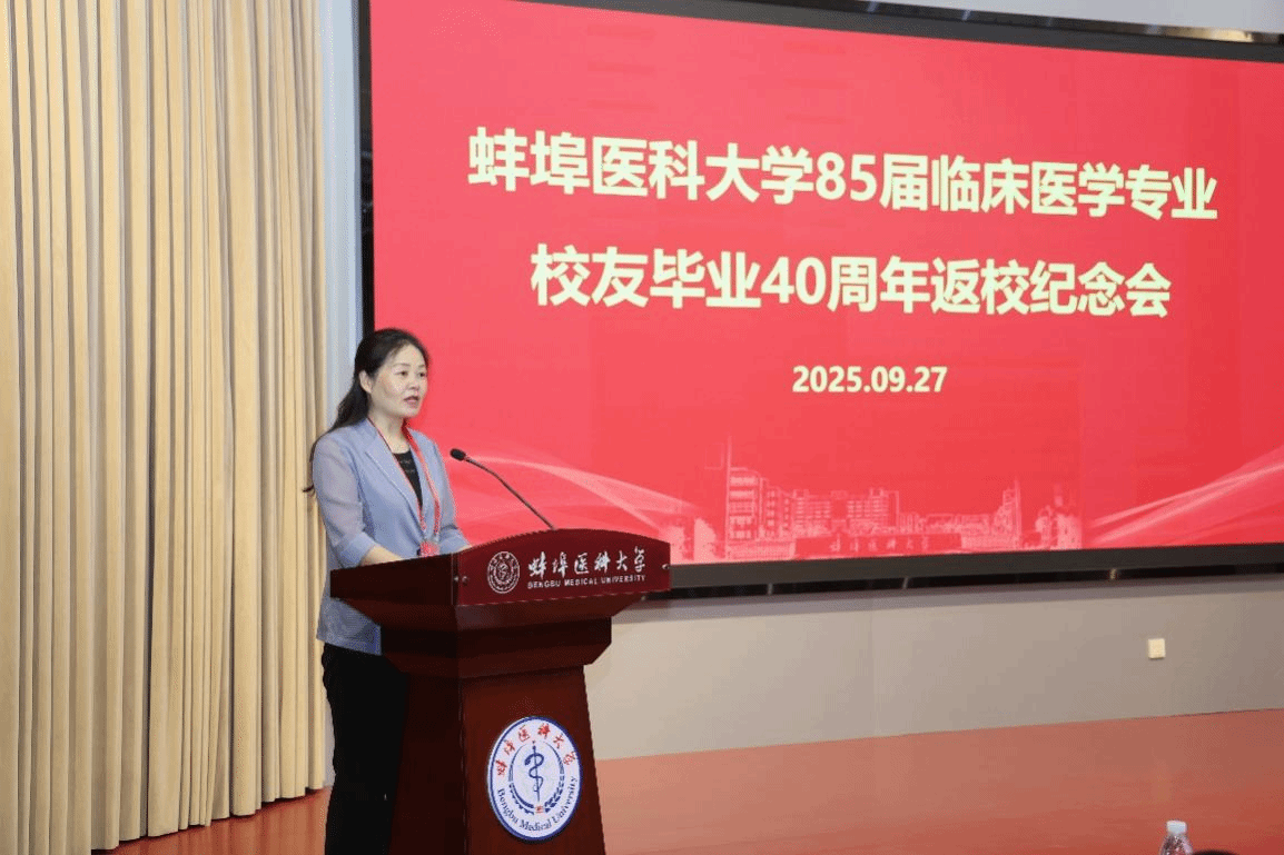 郑兰荣代表学校向校友们表示欢迎,并对大家长期以来对母校的关心与支持致以最诚挚的感谢!她表示,各位校友始终秉承蚌医精神,在各自岗位上追求卓越、服务社会,以精湛医术守护健康,以仁爱之心传递温暖,用奋斗书写了精彩人生,也为母校赢得了广泛的声誉,母校为你们感到无比骄傲!她指出,近年来,在广大校友的支持下,学校在人才培养、学科科研、开放办学、社会服务等方面等方面实现了新的跨越。母校的每一步跨越,都凝聚着校友们的深情厚谊与默默支持;未来的每一份精彩,也更需要全体校友携手共创。希望大家一如既往地关注母校发展,为母校建设献计献策、贡献力量;学校也将始终如一地做好校友们的坚强后盾,积极搭建交流平台,促进互助合作。