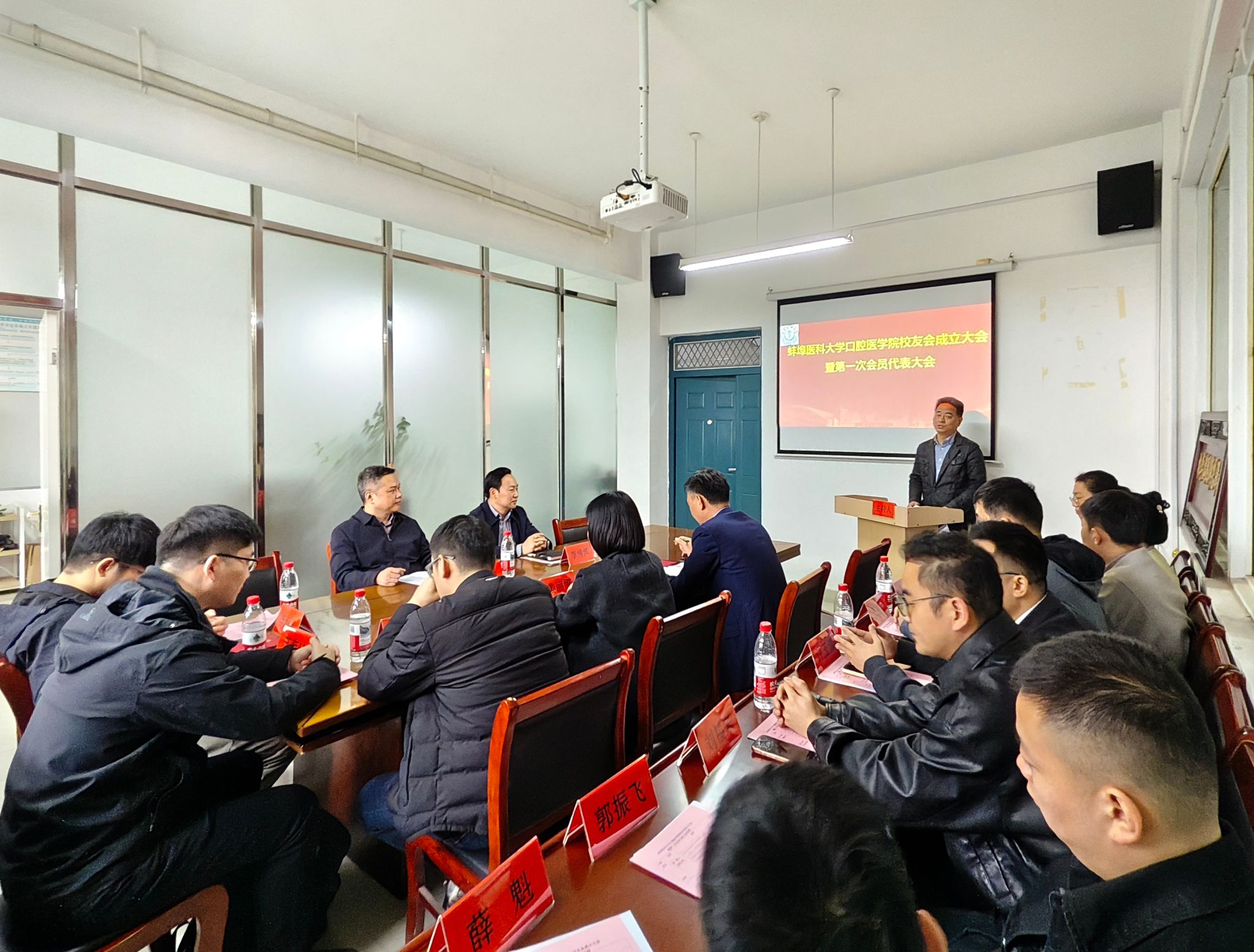 口腔医学院党委副书记、校友会筹备组负责人张云波作《筹备工作报告》;社会合作与医院管理处、校友办副主任王磊宣读《关于同意蚌埠医科大学口腔医学院校友会成立的批复》;与会代表审议并举手表决通过了《蚌埠医科大学口腔医学院校友会章程》、第一届理事会领导机构和人选名单;社会合作与医院管理处、校友办主任李传辉为首届理事会成员颁发聘书。